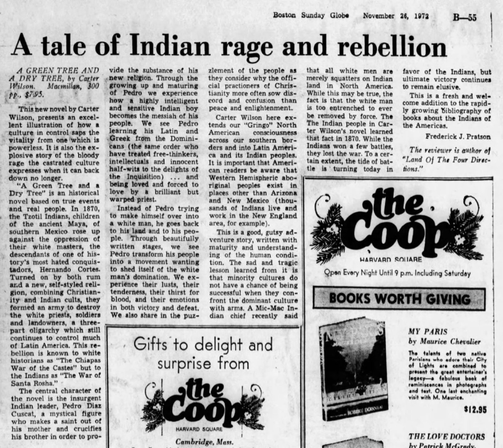 Carter Wilson's A Green Tree and a Dry Tree is, not surprisingly, as much a work about the sources of fiction as a work of fiction. Like any novel worth reading more than once, it has more than one story to tell. First, it is a portrait of Pedro Diaz Cuscat, a Tzotzil Indian who, though educated by white Dominicans, became a visionary and rebel who led his people against the priests and soldiers of their white masters, in the 1870 rebellion known to Mexican historians as "The Chiapas War of the Castes." But in recounting Cuscat's story, Wilson also details how he, as novelist, tracked this story down, searched it out in historical documents and folk tales, came to understand it by studying social custom and innuendo, and finally realized its meaning for his own life.