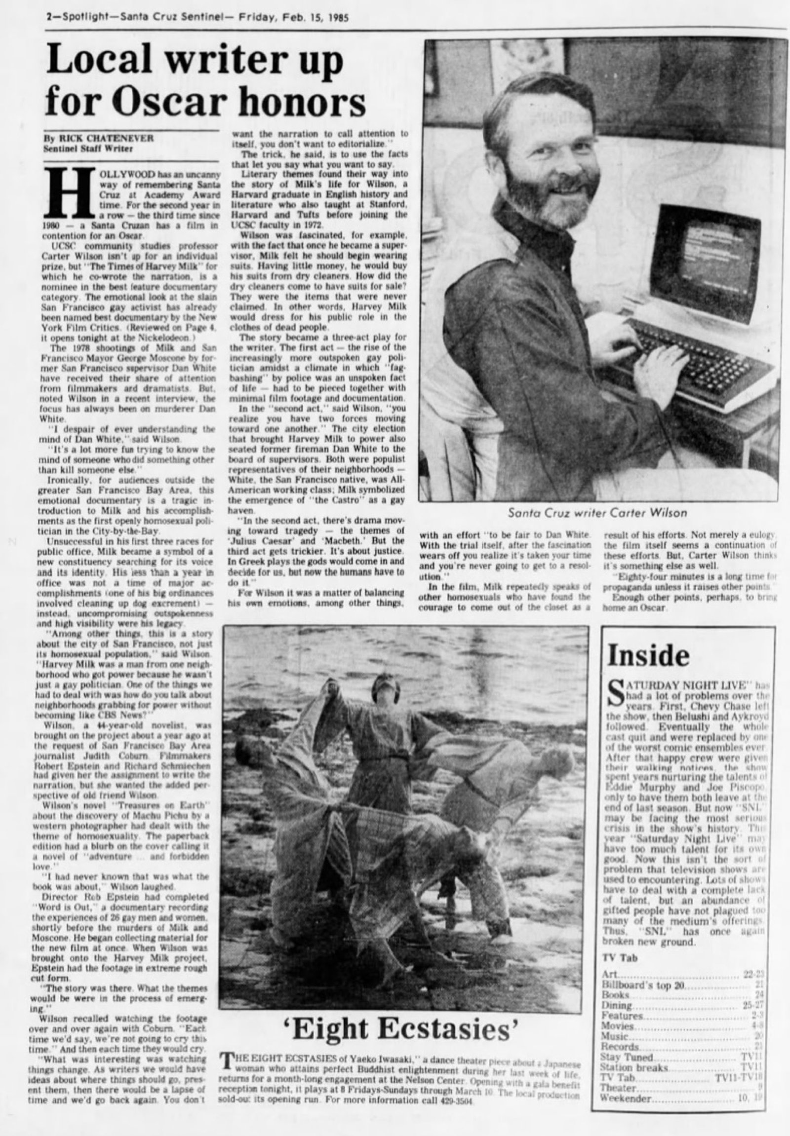 A gay activist, Wilson wrote the narration for two Oscar-winning documentaries, “The Times of Harvey Milk.”and “Common Threads”.