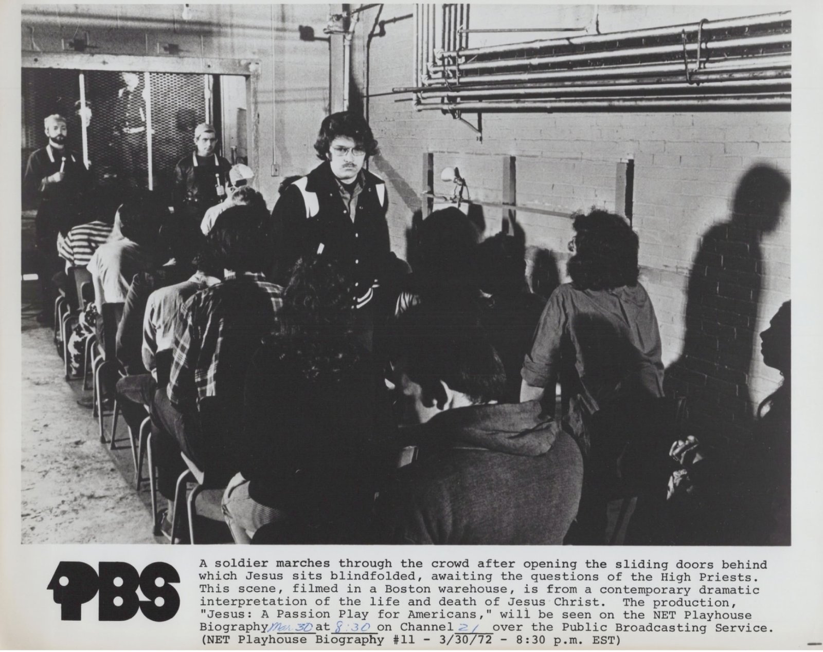 The "Jesus: A Passion Play for Americans" broadcast was a 1972 production aired on NET Playhouse, which was produced through the facilities of WGBH in Boston. This contemporary adaptation of the life and death of Jesus Christ was broadcast as part of the NET Playhouse Biography series.
