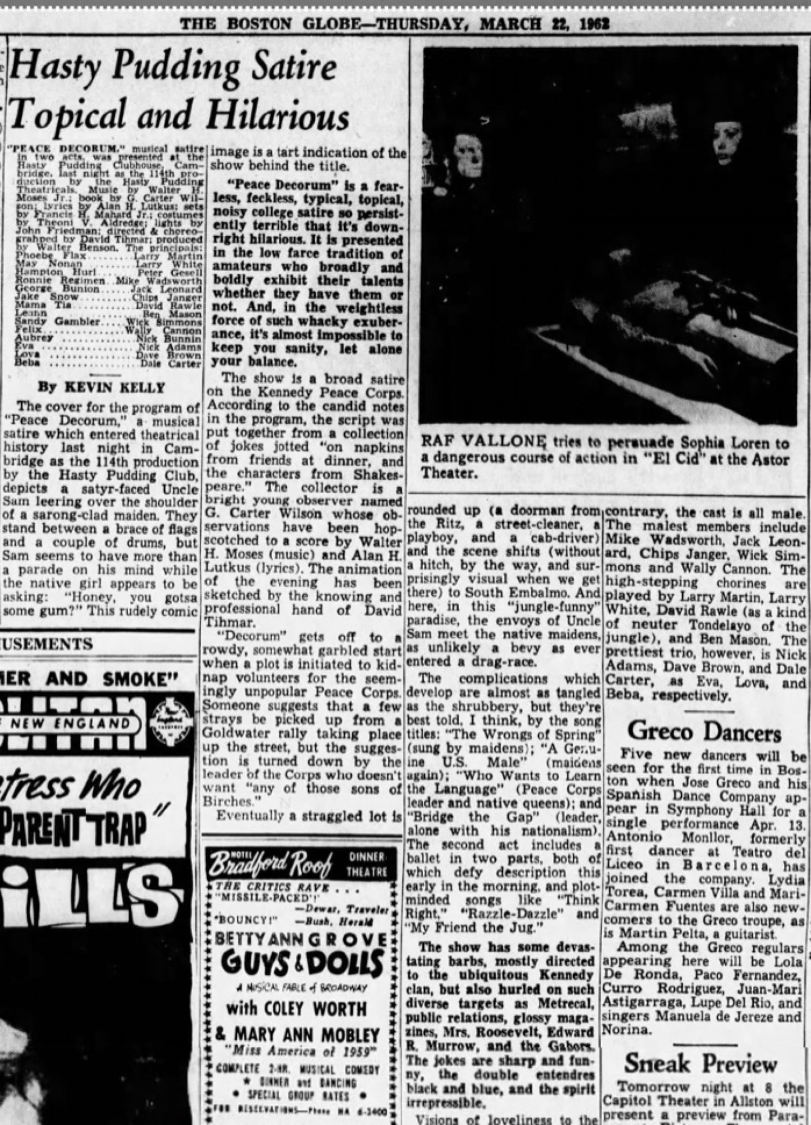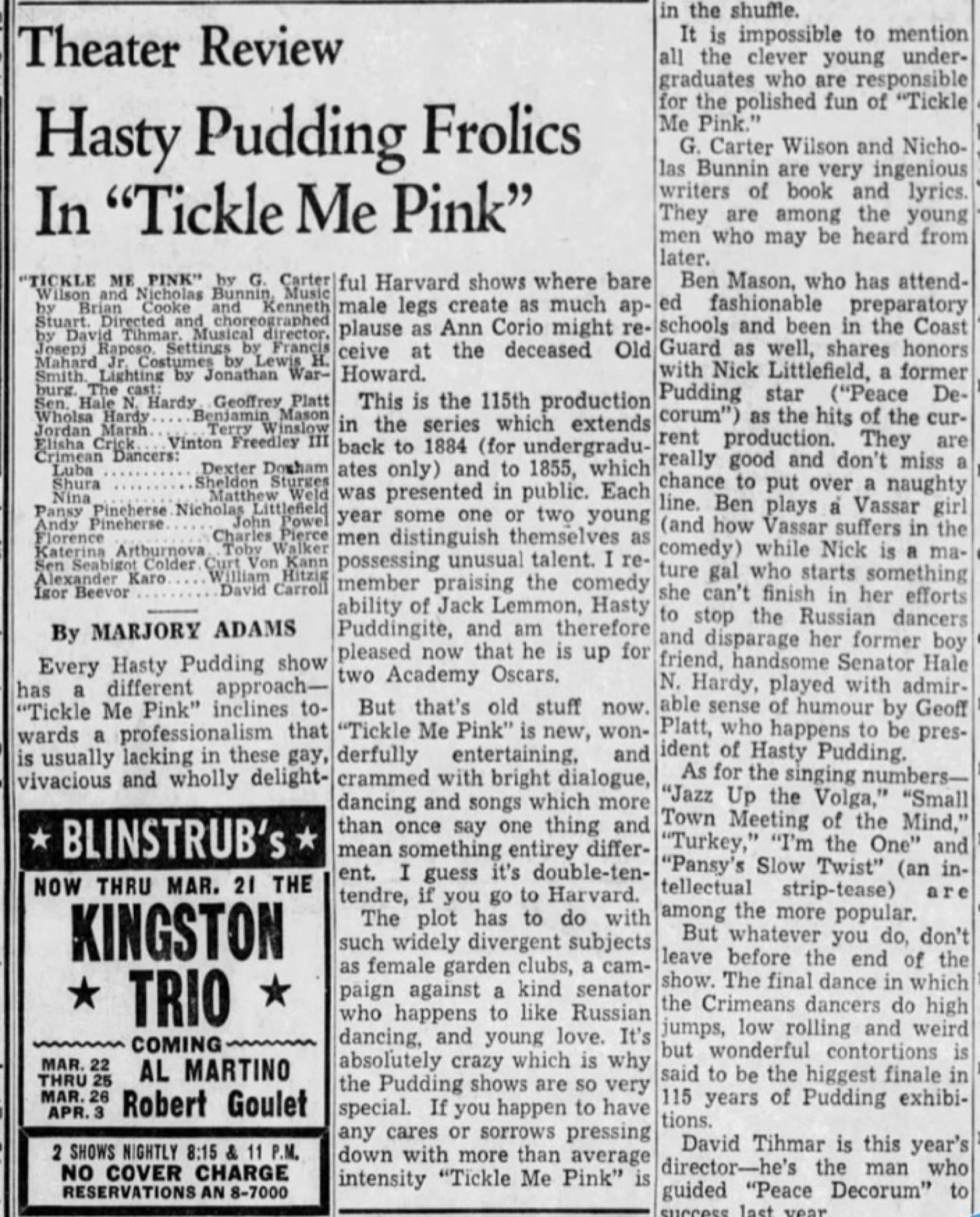 At the beginning of Spring semester, David Tihmar and I, Alan Lutkus, Wally Benson and David Rawles, who was President of the Hasty Pudding Theatricals (whatever that meant), sat down at a table at the back of the theater full of that glassy expectancy and professional good will you’re supposed to radiate to actors at an audition. Wally Moses accompanied each hopeful on the piano as he sang a song while the rest of us scribbled notes. Someone had clued Tihmar in on how the Pudding worked, but I remained entirely out of it. The fact was the try-outs were fairly rigged and “talent” figured only in some of the lesser casting. Wally Benson, the producer, had considerable experience as a lighting director for more serious dramatic enterprises at Harvard and was able to rope in several accomplished fellows, including the male lead, Peter Gesell, who played a kind of Sargent Shriver character.