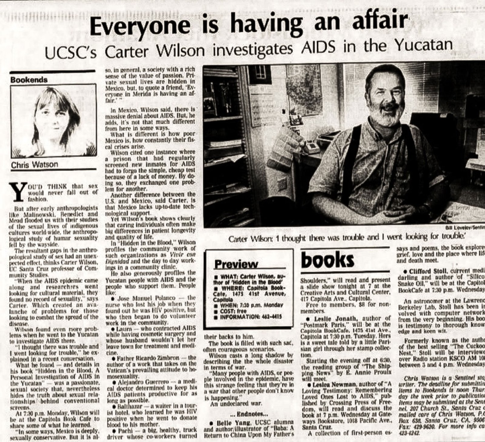 "For those who hanker for voices, Carter Wilson's Hidden in the Blood: A Personal Investigation of AIDS in the Yucatan offers just the nostrum: this humane little memoir is a polished and revelatory gem. Wilson, a novelist, embarks on an investigation of AIDS and sexuality in a part of Mexico that is beginning to see its first cases of HIV disease. He has anthropological training, and it shows: the book is ethnographically rich but unburdened by the jargon of our field. Wilson offers a compelling and textured portrait of an AIDS clinic serving Merida, the large but conservative capital of the Mayan lowlands."