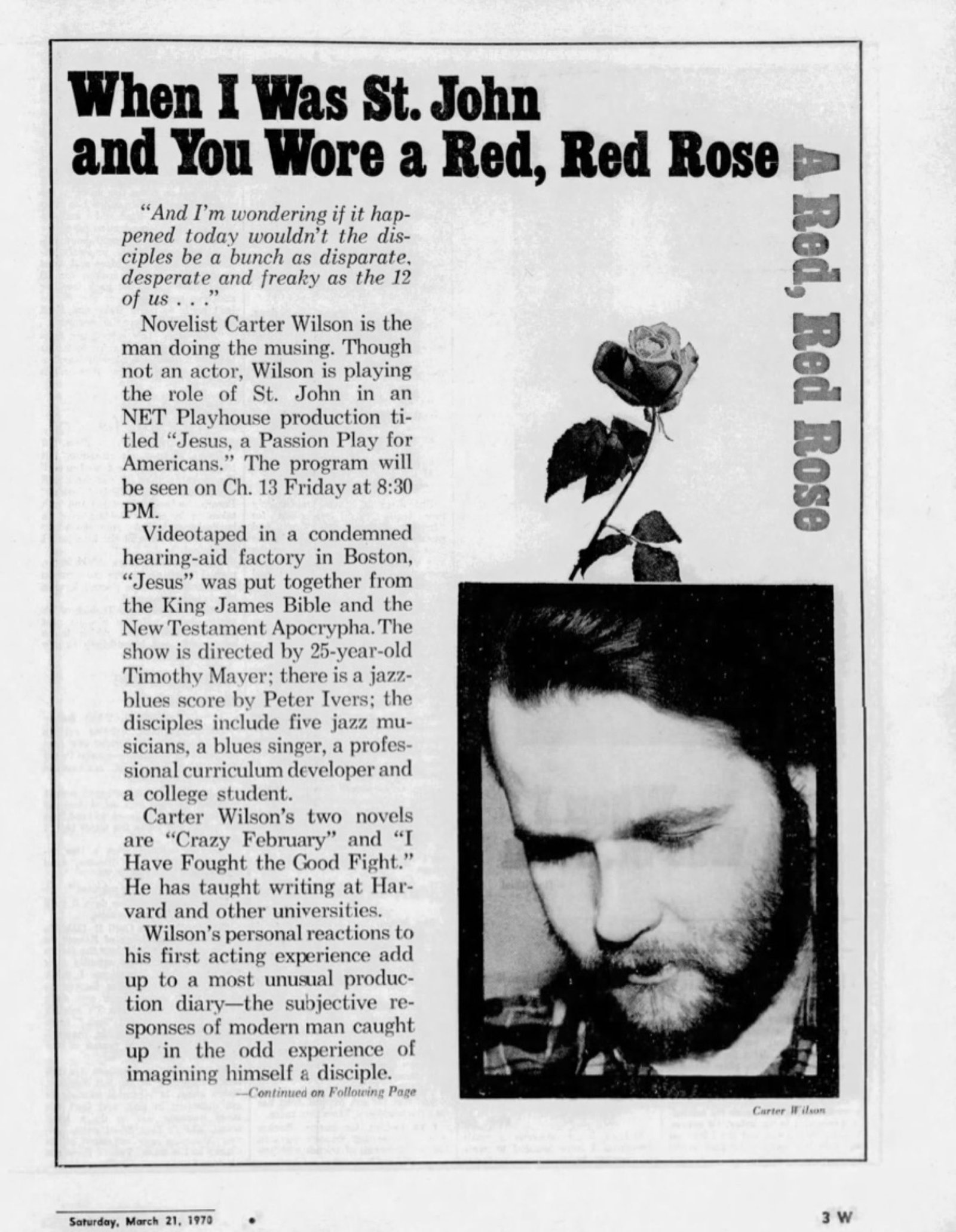The "Jesus: A Passion Play for Americans" broadcast was a 1972 production aired on NET Playhouse, which was produced through the facilities of WGBH in Boston. This contemporary adaptation of the life and death of Jesus Christ was broadcast as part of the NET Playhouse Biography series.